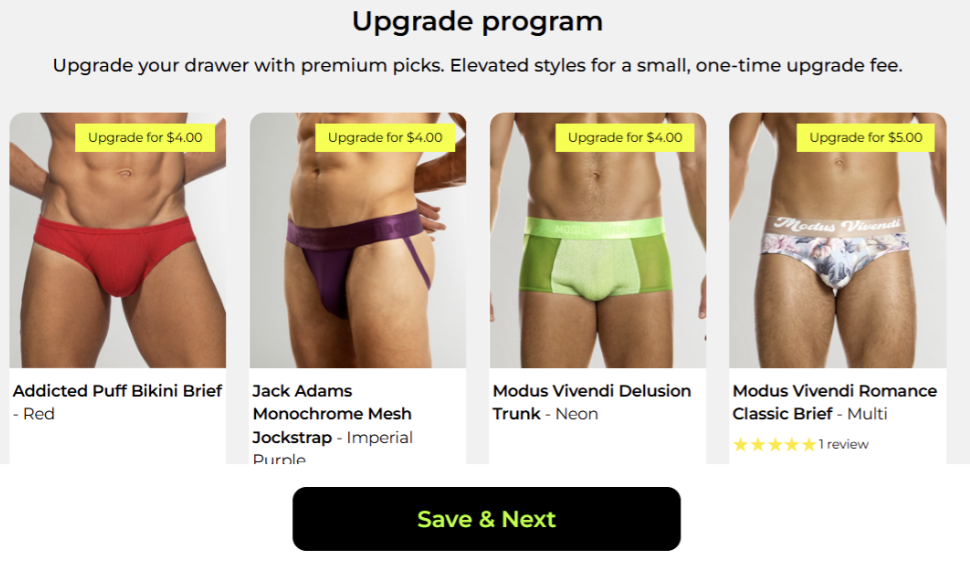 The Upgrade Program is an exclusive benefit for Underwear Club subscriber's renewal boxes. It allows you to add premium and higher-end underwear to your next box for a small, one-time additional fee, always less than the retail price. It rewards loyal members with access to exclusive, top-tier styles not included in the standard box.
